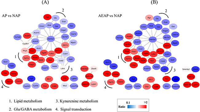 Figure 4: Metabolic network of regulated proteins in AP rats (A) and AEAP rats (B). Proteins regulated in AP and AEAP rats were submitted to STRING 9.0 for network analysis. Sub-networks related to Lipid metabolism, kynurenine metabolism, Glu/GABA metabolism and Signal transduction were identified. The network includes 56 nodes and 78 edges. The node color represents the quantitative ratio.
