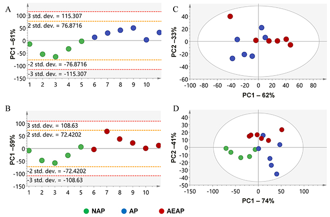 Figure 5: Principal component analysis (PCA) of the liver metabolite extracts for alcohol preferring and non-preferring rats. (A) NAP vs. AP; (B) NAP vs. AEAP; (C) AP vs. AEAP; (D) all groups. Red: AEAP rats, Green: NAP rats, Blue: AP rats.