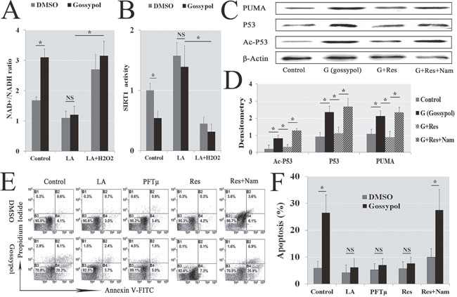 Figure 8: Gossypol induced apoptosis through SIRT1-P53-PUMA pathway. The mGSCs were pretreated with LA and/or H2O2 for 1 h, and then added 5 μM gossypol. The NAD+/NADH ratio decreased in gossypol treatment, recovered in LA pretreatment contrasting with the gossypol, but H2O2 pretreated could abolish the Res effect (A). SIRT1 enzyme activity was inhibited in gossypol treatment, and increased in LA pretreating and abolished in LA + H2O2 coprocessing (B). To illuminate the pathway of gossypol cytotoxicity, mGSCs were pretreated with Res (Resveratrol, a SIRT1 activator) and/or Nam (Nicotinamide, a SIRT1 inhibitor) for 1 h, and then added 5 μM gossypol, after treating with gossypol 6 h Western blotting was used to demonstrate the protein concentration of Ac-P53, P53 and PUMA, the relatively quantified by ImageJ (V1.48d) indicated intracellular ROS concentration could affect this pathway (C and D). The Annexin V-FITC/PI analysis demonstrated gossypol induced 27% cell apoptosis, but LA, PFTμ (Pifithrin-μ, a p53 inhibitor) and Res pretreatment almost completely alleviated the gossypol-induced apoptosis. Pretreating with Res and 100 nM Nam abolished the Res alleviated apoptosis (E and F), which confirmed the above results.