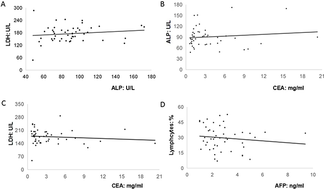 Figure 2: The relationships among peripheral biomarkers in these forty-eight non-AFP-producing patients. (A). The level of alkaline phosphatase (ALP) was not significantly associated with the level of lactate dehydrogenase (LDH) (R2 = 0.021); (B). The level of CEA was not significantly associated with the level of ALP (R2 = 0.0141); (C). The level of CEA was not significantly associated with the level of LDH (R2 = 0.013); (D). The level of AFP was not significantly associated with the percentage of peripheral lymphocytes (R2 = 0.0152).