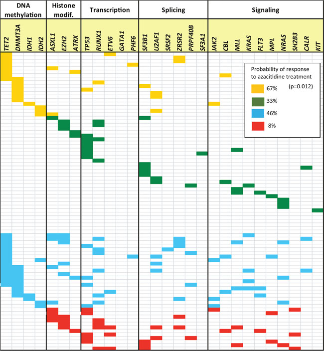 We have found that the profile of several gene mutations identified at diagnosis may represent a useful predictive biomarker of the response to azacitidine therapy in patients with MDS. Accordingly, patients with a total of ≤2 somatic mutations in candidate genes and ≥1 mutation in genes of the DNA methylation pathway (TET2, DNMT3A, IDH1, and IDH2) had an overall response rate of 67%, which is well above the typical expected value (40–50%). By contrast, patients with >2 somatic mutations in total but having none in the aforementioned pathway represented the group with the lowest probability of response to treatment with azacitidine (8%). Meta-analysis revealed that the TET2 gene is the strongest biomarker of clinical response.