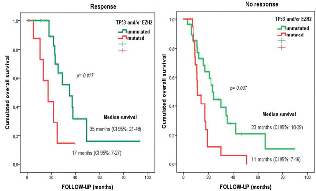 Figure 2: Overall survival for responder and non-responder patients depending on EZH2 and/or TP53 mutational status. Median overall survival of 35 months versus 17 months (in TP53 and EZH2 wild-type versus TP53 and/or EZH2 mutated patients, respectively) in responders to azacitidine (log rank statistic p=0.017). Median overall survival of 23 months versus 11 months (in TP53 and EZH2 wild-type versus mutated patients) in non-responders to azacitidine (log rank statistic p=0.007).