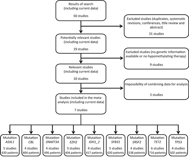Figure 3: Flow chart of studies included and excluded in the meta-analysis. Fifty papers were identified in the electronic databases PubMed, Embase, Cochrane library and Web of Science. Revisions and studies with no genetic information or no hypomethylating therapy were excluded. Finally, seven studies (including current data) containing mutational status of 9 genes were included in the meta-analysis.