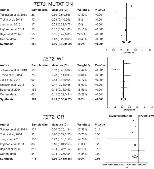An additional strength and novelty of our study is the systematic review of the literature and subsequent meta-analysis, allowing us to confirm the significant role of TET2 mutations in response to azacitidine. Despite the heterogeneity among studies, the high number of patients in each group (mutated and ‘wild-type’ patients by each gene analyzed) supports the validity and generalizability of our meta-analysis.