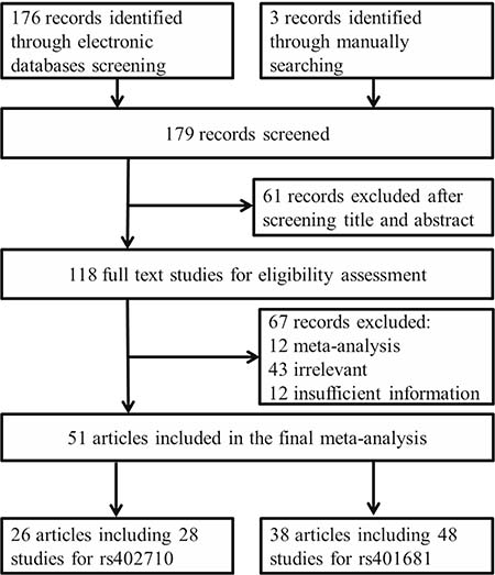 PubMed and EMBASE electronic databases were screened for publications investigating the association between CLPTM1L polymorphisms and overall cancer risk published prior to May 1, 2017. The following search terms were used: “CLPTM1L”, “5p15”, “polymorphism”, “variant”, “cancer”, “tumor” and “carcinoma”. Additional relevant studies were also retrieved manually from all the relevant publications, including the eligible original publications and reviews. Only the latest or the largest study would be included in the final meta-analysis.