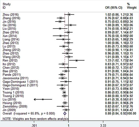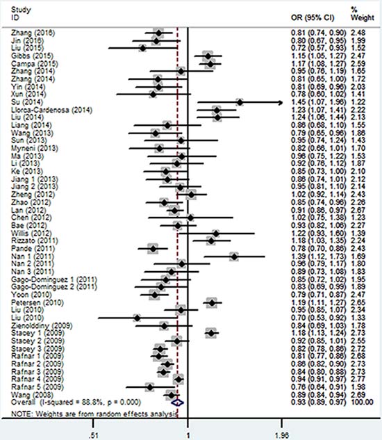 Figure 3: Forest plot of the association between CLPTM1L rs401681 polymorphism and overall cancer risk under the allele contrast model.