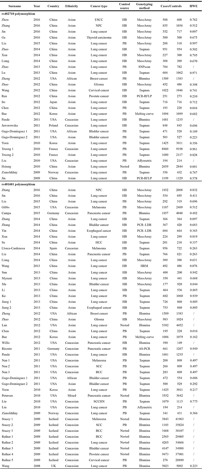 ESCC, esophageal squamous cell carcinoma; NPC, nasopharyngeal carcinoma; HCC, hepatocellular carcinoma; SCC, squamous cell carcinoma; BCC, basal cell carcinoma; SCCHN, squamous cell carcinoma of the head and neck; HB, hospital based; PB, population based; PCR-RFLP, polymerase chain reaction-restriction fragment length polymorphism; PCR–LDR, polymerase chain reaction–ligation detection reaction; HRM, high-resolution melt; AS-PCR, allele-specific polymerase chain reaction; HWE, Hardy-Weinberg equilibrium.
