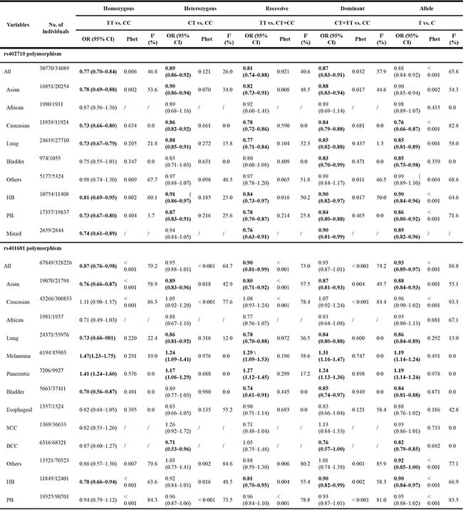 Table 2: Meta-analysis of the association between rs402710 and rs401681 polymorphisms and cancer risk