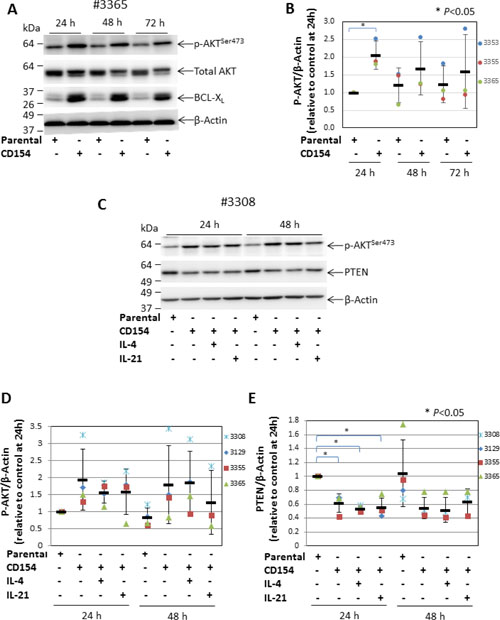 Figure 1: CD40 stimulation-induced AKT activation is associated with decreased expression of PTEN. (A) CLL cells were cultured on a monolayer of parental control or CD154-expressing fibroblasts for 24, 48 and 72 h. At the indicated time points, CLL cells were harvested and analysed for the levels of p-AKT (serine 473) and total AKT by Western blotting. BCL-XL was probed as a marker for CD40 stimulation. β-actin was used as a loading control for densitometric analysis. One representative blot from 3 CLL samples examined is shown. (B) shows a pooled data analysis of the effect of CD40 stimulation on levels of p-AKT in co-cultured CLL cells. In this and subsequent figures, each bar represents the mean ± SD, unless otherwise stated. (C) CLL cells were co-cultured for 24 and 48 h as in (A) but in the presence or absence of recombinant human IL-4 (10 ng/ml) or IL-21 (12.5 ng/ml). CLL cells were then harvested and analysed for levels of p-AKT (serine 473) and PTEN by Western blotting. One representative blot from 4 CLL samples examined is shown. (D) shows a pooled data analysis of the effect of CD40 stimulation on levels of p-AKT in co-cultured CLL cells as in (C). (E) shows a pooled data analysis of the effect of CD40 stimulation on levels of PTEN in co-cultured CLL cells as in (C).