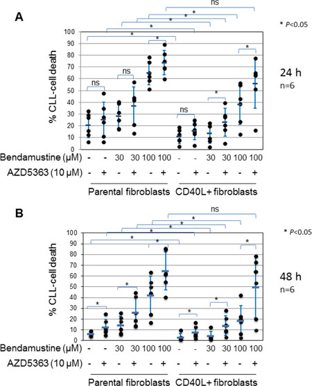 Figure 2: AKT is required for CD40 stimulation-mediated survival and inhibition of bendamustine-induced cell death. CLL cells were cultured on a monolayer of control or CD154-expressing fibroblasts in the presence or absence of bendamustine at the indicated concentration with or without AZD5363 (10 μM) for 24 h (A) and 48 h (B). Co-cultured CLL cells were then harvested at the indicated time points and cell death was determined by PI inclusion on flow cytometry as described in Method. Each data set represents mean ± SD from 6 independent experiments using CLL cells from 4 different patients. Also actual data from individual CLL samples are shown in filled dot.