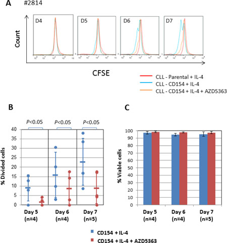 Figure 4: AKT is required for proliferation induced by CD154 + IL-4. (A) CFSE labelled CLL cells were co-cultured with CD154-expressing fibroblasts in the presence of recombinant human IL-4 (10 ng/ml) in the presence or absence of AKT inhibitor AZD5363 (10 μM) over a period of 7 days. CFSE labelled CLL cells co-cultured with parental control fibroblasts were used as a negative control. At the indicated time points, co-cultured CLL cells were harvested and measured for reduction of CFSE fluorescence intensity by flow cytometry as in Figure 3A. Representative CFSE histograms of co-cultured CLL cells between 4 and 7 days from one of the five patient samples are shown. (B) Pooled data analysis of % divided cells among co-cultured CLL cells shows that addition of AZD5363 (10 μM) significantly reduced % divided cells in CD40 + IL-4-stimulated CLL cells. (C) Viability of co-cultured CLL cells as in (B) was determined by PI exclusion/flow cytometry method as described in Method. Pooled data analysis shows that 10 μM AZD5363 had no effect on cell viability of co-cultured cells.