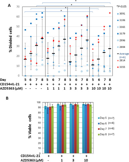 To confirm the anti-proliferative effects of AZD5363, the above experiments were repeated using MK-2206 at concentrations of 1, 3 and 10 μM. In the six samples where proliferation was inhibited by AZD5363, MK-2206 produced a concentration-dependent inhibition of CLL-cell mitosis induced by CD154 + IL-21 (Supplementary Figure 5A, blue symbols). MK-2206 at concentrations of 1 and 3 μM had no effect on cell viability at these concentrations (Supplementary Figure 5B). Similarly, in the two samples where proliferation was not inhibited by AZD5363, MK-2206 at concentrations of 1 and 3 μM did not significantly inhibit CLL-cell mitosis induced by CD154 + IL-21 (Supplementary Figure 5A, red symbols). When MK-2206 was used at a concentration of 10 μM, a reduction in the percentage of divided cells was observed (Supplementary Figure 5A). However, this corresponded to a reduction in viability (Supplementary Figure 5B). MK-2206 at 10 μM reduced the viability particularly in the two samples where proliferation was not inhibited by AZD5363 and MK-2206 at 1 and 3 μM concentrations, with an average viability of 51% at day 5, 50% at day 6, 24% at day 7 and 23% at day 8, respectively. This indicates a cytotoxic effect of the inhibitor at this concentration. Taken together, the two AKT inhibitors with different modes of action produced similar effects on CLL-cell mitosis induced by CD154 + IL-21, both inhibiting proliferation in the same six patient samples but not inhibiting such proliferation in the two other samples.