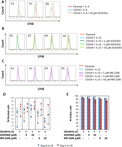 Figure 7: CD40 stimulation-induced proliferation in normal B cells does not require AKT. (A) CFSE labelled normal B cells were co-cultured with CD154-expressing fibroblasts in the presence of recombinant human IL-4 (10 ng/ml) over a period of six days with or without AZD5363 (10 μM). CFSE labelled normal B cells co-cultured with parental fibroblasts plus IL-4 were used as a negative control. At the indicated time points, co-cultured B cells were harvested and proliferation was measured as in Figure 3A. One set of representative CFSE histograms from the time-course experiments using three individual normal B cell samples is shown. (B) CFSE labelled normal B cells were co-cultured with CD154-expressing fibroblasts in the presence of recombinant human IL-21 (12.5 ng/ml) over a period of five days with or without AZD5363 at the indicated concentrations. At the indicated time points, co-cultured B cells were harvested and proliferation was measured as in (A). One set of representative CFSE histograms from three different normal B cell samples examined is shown. (C) CFSE labelled normal B cells were co-cultured with CD154-expressing fibroblasts in the presence of recombinant human IL-21 (12.5 ng/ml) over a period of five days with or without MK-2206 at the indicated concentrations. At the indicated time points, co-cultured B cells were harvested and proliferation was measured as in (A). One set of representative CFSE histograms from three different normal B cell samples examined is shown. (D) Pooled data analysis shows that neither AZD5363 nor MK-2206 at the indicated concentrations inhibited CD154 + IL-21-induced proliferation in normal B cells. (E) Pooled data analysis on the viability of the co-cultured normal B cells as described in (D) shows that neither AZD5363 nor MK-2206 at the indicated concentrations adversely affected the viability of the co-cultured normal B cells.