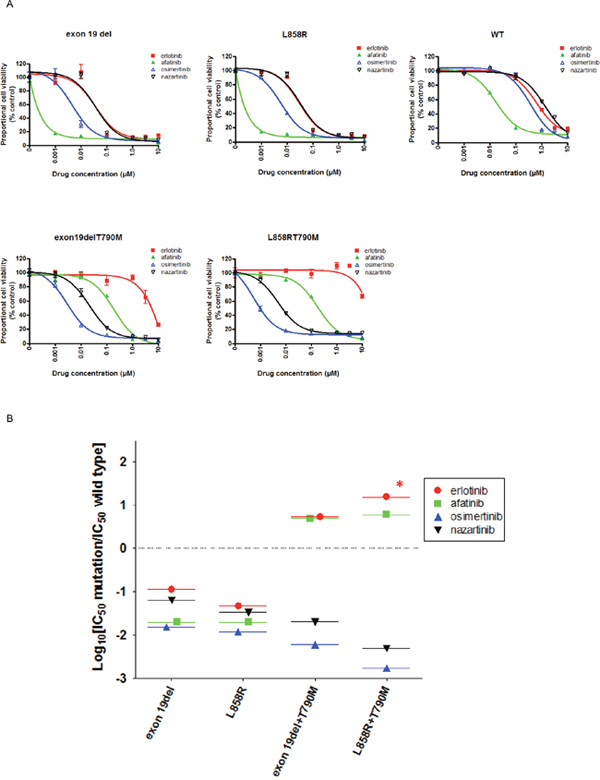 Figure 1: The sensitivity of Ba/F3 cells expressing wild type (WT) or mutant EGFR to EGFR-TKIs. (A) MTS assays were conducted in Ba/F3 cells expressing the indicated EGFR genotypes. Data points represent the mean ± standard deviation. (B) Selectivity index (SI) values were calculated for cells expressing the indicated EGFR mutations versus wild type.*; SI index >1.