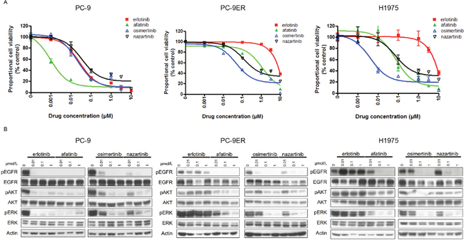 Figure 2: The sensitivities of lung cancer cell lines to EGFR-TKIs. (A) MTS assays of PC-9, PC9-ER, and H1975 cells exposed to the indicated EGFR-TKIs. Data points represent the mean ± standard deviation. (B) PC-9, PC9-ER, and H1975 cells were treated with the indicated concentrations of EGFR-TKIs for 4 h prior to immunoblotting for the phosphorylated (p) and non-phosphorylated forms of EGFR, AKT, and ERK. Actin was used as a loading control.