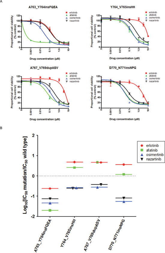 Figure 3: The EGFR-TKI sensitivity of Ba/F3 cells harboring the indicated EGFR genotypes. (A) MTS assays were conducted in Ba/F3 cells harboring the indicated EGFR exon 20 insertion mutations. Data points represent the mean ± standard deviation. (B) The selectivity index (SI) values are shown for the indicated EGFR-TKIs in Ba/F3 cells expressing the indicated EGFR exon 20 insertion mutations.