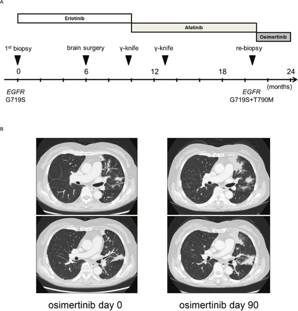 Figure 5: (A) Clinical course after diagnosis of NSCLC. (B) Clinical response to osimertinib in a patient with NSCLC harboring EGFR G719S+T790M. Chest computed tomography images of the patient were captured before and after osimertinib treatment.