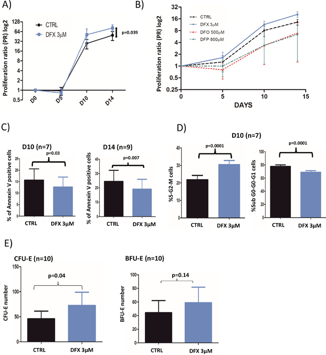 Figure 1: (A) Cell proliferation rates with or without 3 μM DFX (n=18). Proliferation rates were given as a proliferation ratio (PR) consisting in the number of cells counted at each day of analysis divided by the initial number of CD34+. CD34+ from myelodysplastic patients cells treated with DFX 3μM had a better proliferation rates (p=0.039) at the end of the cell culture period (day 14). (B) Proliferation rates after DFX (3μM) treatment in comparison with deferoxamine (DFO; 500μM) or deferiprone (DFP; 800μM) for 3 samples of CD34+ from myelodysplastic patients. (C) Results of apoptosis assay (% of annexin V positive cells) assessed by flow cytometry using annexin V staining. (D) Cell cycle was analyzed by flow cytometry with DAPI staining (n=7) and the two histograms correspond to cells in mitosis and S-phase (left) or in other phases of the cycle (right). (E) Clonogenic assays were started at D5 (n=9) of the erythroid differentiation model. BFU-E: Burst Forming Unit-Erythroid; CFU-E: Colony Forming-Unit-Erythroid.
