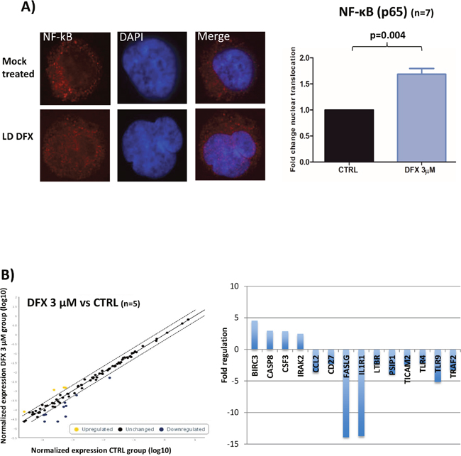 Figure 2: (A) Results of confocal immunofluorescence microscopy assays for NF-κB (n=7). Nuclei are stained in blue; the red signal represents the p65 subunit of NF-κB; x 63. Histogram representing the fold of change of NF-κB nuclear translocation. Data were analyzed by a specific software (ICY) to determine the nuclear fluorescence of NF-κB in the nucleus. Data were normalized to the CTRL condition in each case. (B) Results of the RT-qPCR microarray plates used to assess the impact of DFX on the expression of 84 known gene targets of NF-κB activation (n=5). Scatter plots represent the normalized expression of NF-κB targeted genes between DFX and CTRL conditions. The central line indicates unchanged gene expression. The dotted lines indicate the selected 2-fold regulation threshold. Data points beyond the dotted lines in the upper left area (yellow) are over expressed genes and those in the lower right sections (blue) are under expressed genes. Baculoviral IAP Repeat Containing 3 (BIRC3), caspase 8 (CASP8), Colony Stimulating Factor 3 (CSF3), and Interleukin 1 Receptor Associated Kinase 2 (IRAK2). Fas Ligand (FASLG), Interleukin 1 Receptor Type 1 (IL1R1), Toll Like Receptor 9 (TLR9), PC4 and SFRS1 Interacting Protein 1 (PSIP1), C-C Motif Chemokine Ligand 2 (CCL2), TNF Receptor Associated Factor 2 (TRAF2), Lymphotoxin Beta Receptor (LTBR), Toll Like Receptor Adaptor Molecule 2 (TICAM2), CD27, and Toll Like Receptor 4 (TLR4).