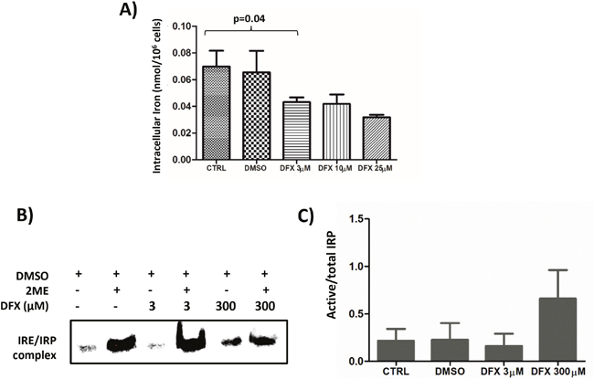 Figure 3: (A) Decreased intracellular iron content after DFX treatment as measured by ICP-MS. K562 cells were treated with increased doses of DFX for 48 hours (n=4). (B) Representative (n=2) Iron Regulatory protein (IRP) activity in K562 cells treated with increasing concentrations of DFX. IRP activity was assessed by REMSA using an Iron Responsive Element (IRE) biotin-labeled probe. The apo-IRP form was activated after treatment with 2-mercaptoethanol (2ME). (C) Histogram representing the ratio of the measured IRP activity divided by the total of IRP activity revealed by the 2-mercaptoethanol treatment (n=2).
