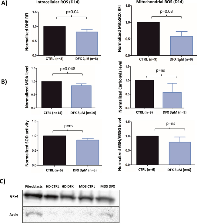 Figure 4: (A) Flow cytometry analysis of intracellular ROS with DHE staining (n=8) and mitochondrial ROS with MitoSOX probe (n=9) at D14 of the cell culture procedure. The data are normalized to the CTRL condition in each case. (B) Levels of MDA, Carbonyls, Glutathione and SOD (SOD 1-3) activity normalized to the CTRL condition. (C) Western blot of GPX4 for MDS patient (three samples were pooled) and healthy donor (n=1). Fibroblasts were used as a positive control.CTRL: control; DMSO: Dimethylsulfoxyde; REMSA: RNA electrophoretic mobility shift assay; HD: healthy donor; IRP: Iron response protein; IRE: Iron Responsive Element; MDA: Malondialdehyde; ROS: reactive oxygen species; SOD: superoxide dismutase.