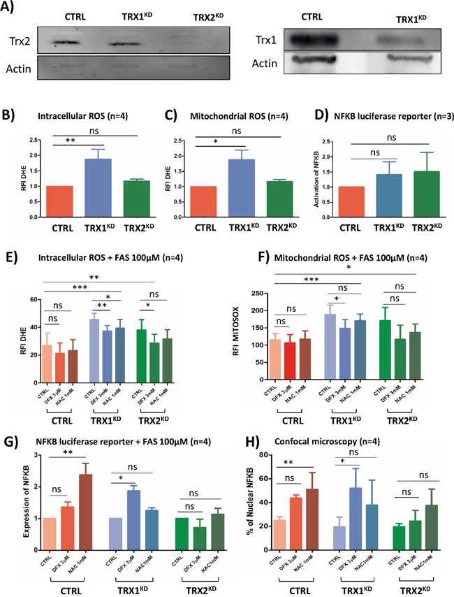 Figure 5: (A) Western blot analysis of Trx1 and Trx2 protein levels in stable TRX1KD and TRX2KD K562 cells. Trx1 and Trx2: 13 kDa; actin: 42 kDa. (B) Flow cytometry analysisof intracellular ROS with DHE staining (n=4) in CTRL and stable TRXKD K562 cells without iron overload. (C) Same experiment as in B for mitochondrial ROS with MitoSOX probe (n=4). (D) Assessment of NF-κB activity with a luciferase reporter assay (n=4) in TRXKD K562 cells without iron overloaded condition. (E) Same experiment as in B with FAS (100μM) and DFX 3μM or NAC 1mM. (F) Same experiment as in C with FAS (100μM) and DFX 3μM or NAC 1mM. (G) Same experiment as in D with FAS (100μM) and DFX 3μM or NAC 1mM. (H) Quantification of NF-κB translocation by confocal microscopy for K562 cells as described in (G). (FAS: ammonium sulfate to the medium, DFX: deferasirox, NAC: N-acetylcysteine; RFI: ratio of fluorescence; KD: knock-down; TRX: thioredoxin; *: <0.05; **: <0.001; ***: <0.0001).