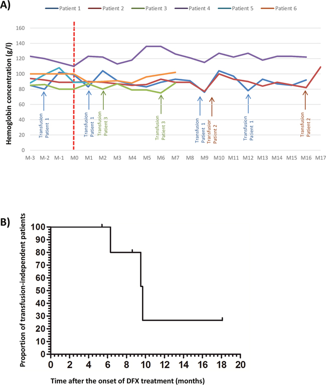 Figure 6: (A) Evolution of the hemoglobin level for 6 anemic patients with low risk MDS and refractory to erythropoiesis stimulating agents treated by low dose of deferasirox (DFX) before and after the beginning of DFX; initial hemoglobin level = T0 DFX). (B) Evolution of the proportion of untransfused patients after DFX treatment for the 6 anemic patients with low risk MDS and refractory to erythropoiesis stimulating agents treated by low dose of DFX.D: day; Hb: hemoglobin level, M: month.