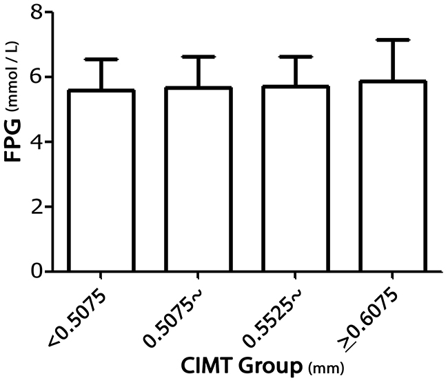 The relationship between conventional risk factors and CIMT is controversial. Traditional and common vascular risk factors, such as hypertension, diabetes mellitus (DM), dyslipidemia, and smoking, have been reported to be associated with increased CIMT [4, 17-24]. Moreover, systolic blood pressure (SBP), glucose levels, and cholesterol levels have also been reported to be associated to CIMT [25-30]. Several studies reported thicker carotid walls in diabetic patients than in individuals with normal fasting glucose levels [31-34]. In diabetic populations, CIMT was associated with fasting glucose concentrations [34-36]. However, the quantitative relationship between fasting glucose concentration and CIMT in a non-diabetic population, which accounts for more than 80% of the population in China, is unclear, especially in China. We thus aimed to assess the relationship between FPG levels and CIMT among the general non-diabetic population in China.