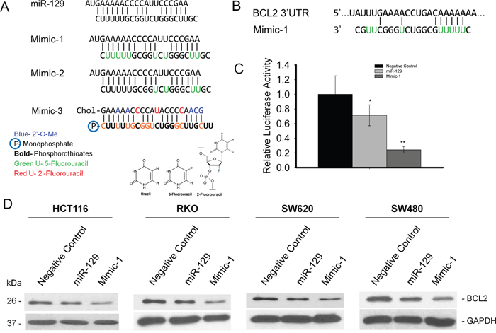Figure 1: miR-129 mimics retain target specificity in human colon cancer cell lines. (A) Sequence of miR-129 mimics with various modifications. (B) The 3’-UTR binding site of BCL2 mRNA with miR-129 Mimic-1. (C) Transfection of miR-129 or Mimic-1 inhibited firefly luciferase activity of pMIR-REPORT-3’-UTR-BCL2. (D) Inhibition of BCL2 expression in HCT116, RKO, SW480, and SW620 colon cancer cell lines analyzed by Western immunoblot. (*p<0.05; **p<0.01).