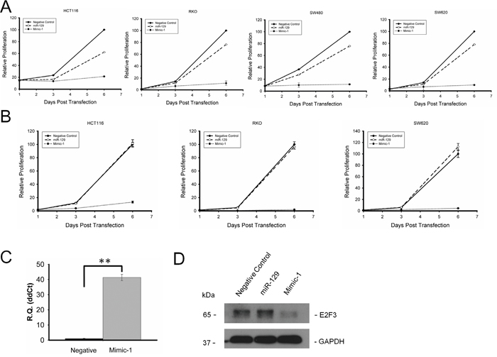 Figure 2: Mimic-1 inhibits colon cancer cell proliferation in HCT116, RKO, SW480, and SW620 colon cancer cell lines with and without transfection reagents. (A) HCT116, RKO, SW480, and SW620 colon cancer cells were transfected with negative control miRNA, native miR-129, or Mimic-1 at the concentration of 50 nM using oligofectamine, and cell proliferation was measured by WST-1 assay (B) HCT116, RKO, SW480, and SW620 colon cancer cells were transfected with negative control miRNA, native miR-129, or Mimic-1 at the concentration of 50 nM without any transfection reagent, and cell proliferation was measured with WST-1 assay. (C) qRT-PCR analysis of Mimic-1 levels in colon cancer cells without transfection reagent. (D) Without transfection reagent, Mimic-1 expression reduced expression of E2F3. (**p<0.01).