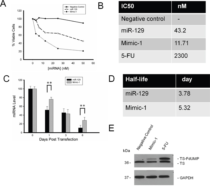 Figure 3: Determination of Mimic-1 half-life and IC50 concentration using HCT116 colon cancer cell lines. (A) Mimic-1 is more potent then unmodified miR-129 on colon cancer cells. (B) The IC50 for Mimic-1 is 11.71 nM compared to 43.2 nM for miR-129. (C, D) Mimic-1 is more stable than miR-129. (E) Formation of the FdUMP-TS complex (the upper shift-band) with 5-FU released from the degraded Mimic-1 is shown by Western immunoblot. (**p<0.01).