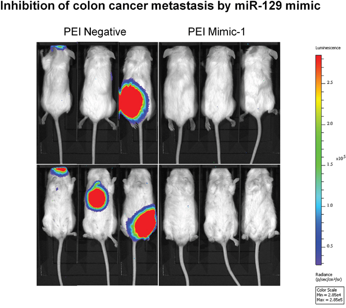 For the in vivo miRNA delivery experiments, we created colon cancer cells that expressed the lenti-luc reporter gene by infecting parental HCT116 cells with a recombinant lentivirus. Luciferase-expressing HCT116 cells (2.0×106 cells per mouse) were suspended in 0.1 mL of PBS solution and injected through the tail vein of each mouse. Two weeks after injection of colon cancer cells, mice were treated via tail vein injection with 40 μg of negative control or Mimic-1 packaged with in vivo-jetPEI (Polyplus Transfection). Mice were treated every other day for 2 weeks (8 times). Following treatment, mice were screened using IVIS Spectrum In vivo Imaging System (IVIS) (PerkinElmer).