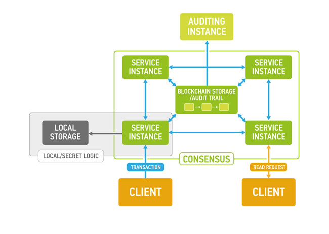 ● (Lightweight) clients implement typical functionality of clients in SOA; they are intended to be the originators of most transactions and read requests in the system, and are correspondingly supplied with cryptographic key management utilities, as well as tools to form transactions and verify (including cryptographically) responses to read requests.
