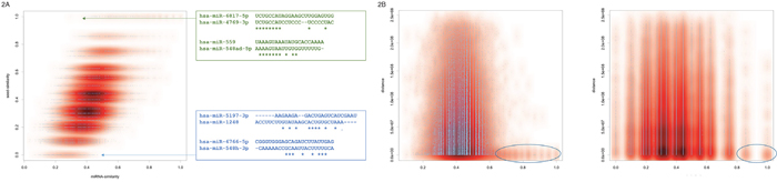 Figure 2: (A) Scatter plot of miRNA sequence similarity score compared to miRNA seed similarity score. Since the plot contains 3.25 million data points, the density distribution is also shown in red. The green and blue sequences represent extreme examples, i.e. miRNAs with high sequence similarity compared to the seed similarity (blue) and miRNAs with high seed sequence similarity compared to the overall lower sequence similarity (green). (B) Scatterplots for the sequence similarity and the seed similarity, each compared to the genomic distance. The blue ellipses highlight miRNAs with similar sequences and similar seeds, respectively, that also have close genomic proximity.