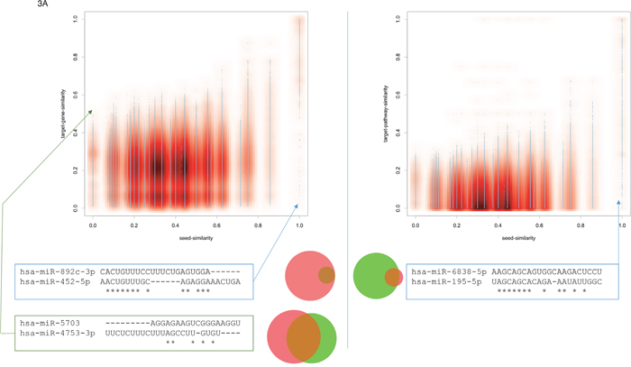 Next, we compared the influence of the seed similarity to the target gene and the target pathway similarity for all pairs of miRNAs. As mentioned in the first paragraph of the results section the seed sequence correlated with both, gene set and pathway similarity. The correlation with the target pathway similarity was even slightly higher as compared to the target gene set similarity. Scatter plots for both cases are presented in Figure 3A. Again, while the information on all 3.25 Million pairs is available in miRPathDB we here pick extreme examples.