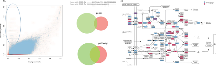 Figure 4: (A) Scatter plot for the target gene set and the target pathway similarity. The ellipse in the upper left part highlights miRNA pairs with overall low target gene similarity and high target pathway set similarity. The example on the right side presents two miRNAs (hsa-miR-3529-5p and hsa-miR-6886-5p) with low target gene similarity and significant target pathway similarity, as demonstrated by the area proportional Venn diagrams. (B) For the two miRNAs from Figure 4A the targeting of the KEGG MAPK signaling cascade is detailed. Targets of miR-3529-5p are highlighted in blue, targets of miR-6886-5p in red and joint targets of both miRNAs in purple. As the figure shows, both miRNAs target specific parts of the pathway such that overall a very large fraction of the path is targeted while the overlap between both miRNAs is small.