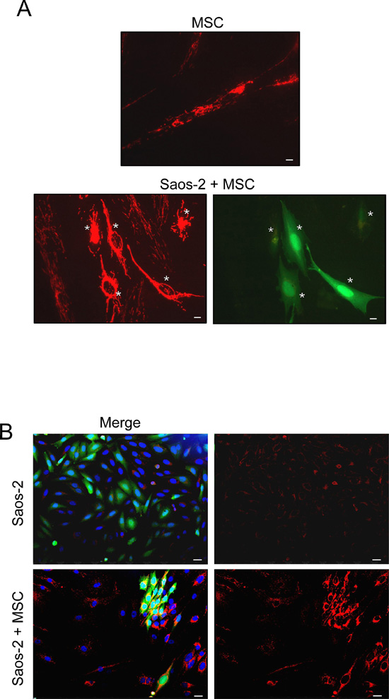 Figure 1: MSC-Saos-2 cell co-cultures exhibit changes in the mitochondrial state (A) MSC decrease their mitochondrial activity in co-cultured Saos-2 cells. Co-cultures of Saos-2 GFP (+) positive cells (green) and MSC were immunostained with MitoTracker (red). Note that co-culture with OS cancer cells induces a significant decrease in the mitochondrial activity of MSC (lower row), as compared to MSC cultured alone (top row). Importantly, images were acquired using identical exposure settings. White asterisks indicated Saos-2 GFP (+) positive cells. Original magnification, 20x; scale bar 10 μm. (B) MSC induce an increase in mitochondrial mass in co-cultured Saos-2 GFP (+) positive cells (green). Homotypic cultures of Saos-2-GFP (first row, merge first panel) and their co-culture with MSC (lower row, merge first panel) were immunostained with an anti-intact mitochondrial membrane antibody (red). DAPI was used to stain nuclei (blue). Note that in co-culture, the mitochondrial mass is clearly increased in Saos-2 cells as compared to the respective homotypic culture. Importantly, images were acquired using identical exposure settings. Original magnification, 20x. Scale bar 20 μm.