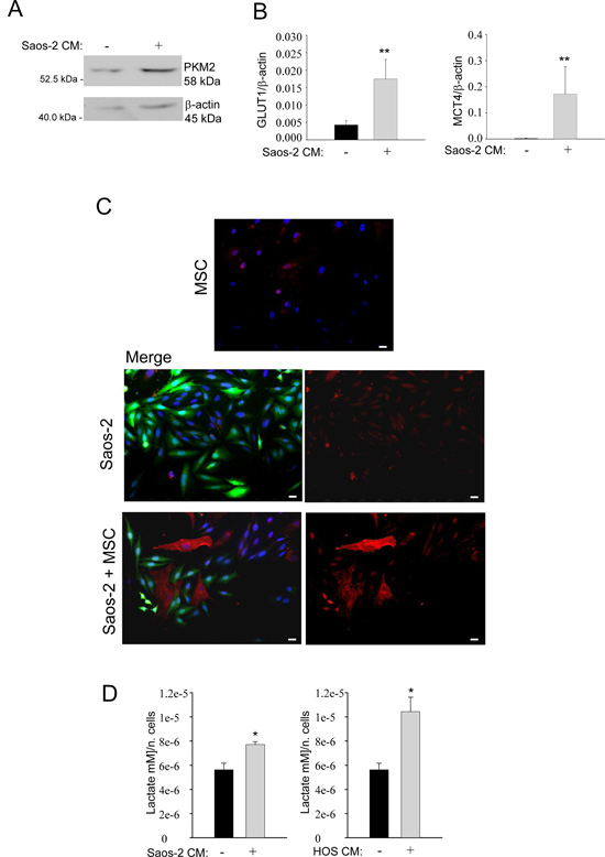Figure 2: Saos-2 cells drive aerobic glycolysis in adjacent MSC. (A) Upregulation of PKM2 in MSC activated by OS cells. Cell lysates were prepared from MSC activated by conditioned medium from serum-starved Saos-2 cells or untreated, non-activated MSC. Lysates were analyzed by Western blot with an anti-PKM2 specific antibody. Note the upregulation of PKM2 in tumor-activated MSC, as compared to untreated MSC. Normalization was done by actin immunoblot. (B) Gene expression analysis of GLUT1 (left plot) and MCT-4 (right plot) by RT-PCR. Note that MSC cultured with CM from Saos-2 cells, show significantly higher levels of the GLUT1 and MCT-4 genes, versus non-activated MSC. Glut1, p=0.0092; MCT-4, p=0.0071. (C) Upregulation of MCT-4 expression was validated by immunofluorescence analysis. Homotypic cultures of MSC (top row) and Saos-2 GFP cells (middle row) and Saos-2-MSC heterotypic cultures (lower row) were immunostained with MCT-4 antibodies. DAPI was used to stain nuclei (blue). Note that the MCT-4 expression (red) is clearly increased in MSC in co-culture condition, as compared to MSC cultured alone. Importantly, images were acquired using identical exposure settings. Original magnification, 20x. Scale bar 40 μm. (D) Tumor-activated MSC show increased lactate secretion. MSC were incubated with CM obtained from OS cells (Saos-2 or HOS) for 48 h. Then, cells were carefully washed and incubated in fresh serum-free medium for an additional 24 h. Lactate assay was performed on this culture medium. Note that lactate production is significantly increased in MSC, after activation with conditioned media from Saos-2 cells (left plot) and HOS cells (right plot). Values were normalized by cell numbers *p<0.05.