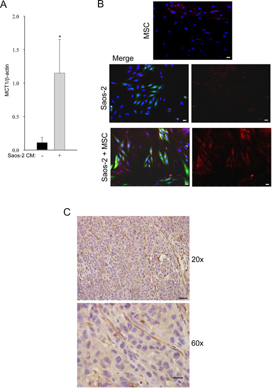 Figure 3: Tumor-activated MSC induce high MCT-1 expression in Saos-2 cells. (A) The result is observed by RT-PCR, *p<0.05. (B) MCT-1 is upregulated in Saos-2-GFP cells co-cultured with MSC. MCT-1 immunofluorescence was performed in homotypic cultures of MSC (top row) and Saos-2 cells (middle row), and in the MSC-Saos-2 cell co-culture system (lower row). Note that MCT-1 expression (red staining) is mainly present in the OS green cells. Merged image is shown in the middle and lower panels. DAPI was used to stain nuclei (blue). Importantly, images were acquired using identical exposure settings. Original magnification, 20x. Scale bar 40 μm. (C) MCT-4 immunohistochemistry was performed on mouse tumor xenograft of human 143B cells. Note that tumor stroma from the host is strongly stained for MCT-4 (brown), while the tumor compartment is poorly stained. Original magnification 20x; scale bar 50 μm (upper row). Original magnification 60x and scale bar 20 μm (lower row).