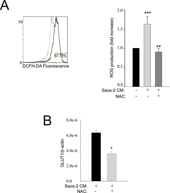 Figure 4: Oxidative stress is increased in activated MSC cells. (A) MSC cells were exposed to conditioned medium from OS cells and evaluated by flow cytometry using DCFH-DA (as a measure of total ROS released). The representative plot of the flow-cytometric analysis shows that about 70% of MSC exposed to the Saos-2 cells-conditioned medium (continuous dark line) exhibit a fluorescence intensity higher than that observed in untreated MSC (dashed light line). The histogram bars show the ratio between “MC of activated MSCs” and “MC of non-activated MSC” (mean ± SEM). The ROS production in MSC challenged with the conditioned medium of Saos-2 cells was significantly increased in comparison to untreated MSC, but the basal activity of MSC is restored when an antioxidant, i.e. NAC, is introduced into the culture system. **p= 0.002; ***p= 0.0005. MC: mean channel of fluorescence intensity. (B) Pre-treatment of MSC with the anti-oxidant NAC decreases the expression of GLUT-1, suggesting that the shift to the Warburg metabolism with increased uptake of glucose depends on oxidative stress, *p<0.05.