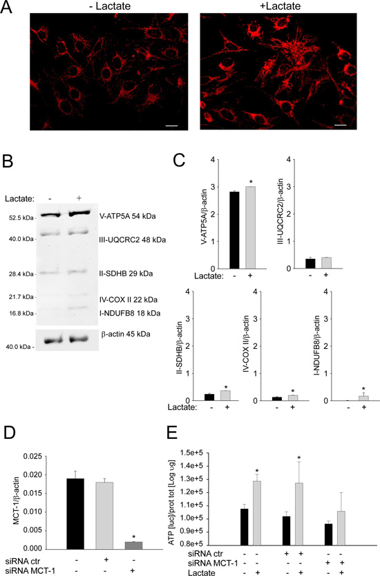 Figure 5: Lactate treatment promotes mitochondrial biogenesis and oxidative phosphorylation in OS cells. (A) Homotypic cultures of Saos-2 cells were treated with or without 10 mM of lactate for 48 hours. Cells were fixed and immunostained with an antibody against the mitochondrial membrane (red). Note that lactate treatment increases mitochondrial mass in Saos-2 cells, mimicking the co-culture condition. Importantly, images were acquired using the same exposure settings. Original magnification, 20x; scale bar 50 μm. (B) Immunoblot analysis of V-ATP5A, III-UQCRC2, II-SDHB, IV-COXII and I-NDUFB8 was performed on Saos-2 cells with or without 10 mM of lactate for 48 hours. Actin immunoblot was used for normalization. (C) The plot reports the densitometric quantitation (ratio of each protein:actin). Note that complex I, complex II, complex IV and V are upregulated in Saos-2 cells after treatment with lactate, as compared to the untreated samples. *p<0.05. (D) Saos-2 cells were treated with MCT-1 specific siRNA and, after 24 hours, the MCT-1 mRNA expression levels were evaluated. The silencing significantly inhibited MCT-1 expression, *p<0.05 vs not treated cells. (E) Homotypic cultures of Saos-2 cells transfected with MCT-1 siRNA, with not-targeting siRNA, or untreated, were incubated with or without 10 mM of lactate for 48 hours. Then, ATP content was evaluated. The silencing of MCT-1 expression impaired the increase in ATP content induced by lactate treatment (*p<0.05 treated with lactate vs untreated).