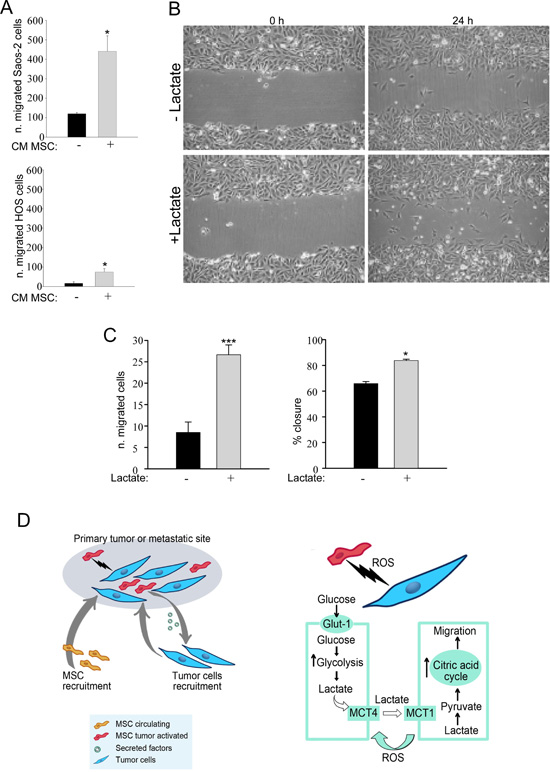 Figure 6: MSC-activated Saos-2 and HOS cells acquire increased migratory capacity. (A) We assessed whether tumor-activated MSC were able to increase the migration of Saos-2 and HOS cells, using a modified Boyden chamber assay. As a control, serum-free CM from non-activated MSC was placed in the lower chambers. Note that CM of previously activated MSC was able to increase the migratory capacity of OS cells, *p<0.05. (B and C) We analyzed Saos-2 and HOS migration by an in vitro scratch assay. OS cells were plated to create a confluent monolayer, which was later scraped. Images were acquired with a phase-contrast microscope. To capture the same field during the image acquisition, marks next to the scratch were used as reference points. (B) Saos-2 cells were treated with or without 10 mM lactate, as indicated. Images were acquired at 0 and 24 hours. Note that Saos-2 treated with lactate migrate faster, as compared to untreated Saos-2 cells. Original magnification, 10x. (C) Quantification of cell migration after scratch assay of Saos-2 cells (left plot) and of HOS cells calculated as % closure (right plot). (D) Proposed model of the metabolic circuit between MSC and OS cells. The left drawing represents the primary tumor or the metastatic site that includes tumor cells and MSC as stromal compartment. The right drawing explains in detail the reciprocal metabolic reprogramming: tumor cells induce MSC to undergo Warburg metabolism leading to increased uptake of glucose and its conversion to lactate. Stromal cells extrude lactate through the shuttle MCT-4. OS cells are able to uptake this metabolite through the MCT-1 transporter, and utilizing it as fuel for their TCA cycle, as well as for cell migration.