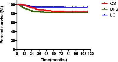 Figure 1: The overall survival (OS), disease-free survival (DFS) and local control (LC) rates of stage IIB cervical cancer patients.