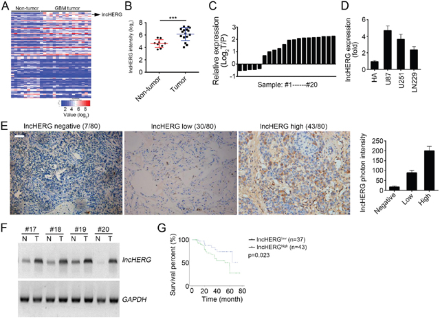 Figure 1: LncHERG is highly expressed in glioblastoma. (A) LncHERG was up-regulated in glioblastoma (GBM) tissues according to a microarray dataset (GSE90598). (B) Analysis of lncHERG expression in non-tumor and GBM tissues according to dataset in GSE90598. (C) The expression levels of lncHERG in GBM tissues and paired peritumor tissues were measured. (D) The expression of lncHERG in normal glial cell line (HA) and GBM cell lines (U87, U251 and LN229) was analyzed. (E) The expression levels of lncHERG in GBM tissues were checked by in situ hybridization (ISH). lncHERG was highly expressed in GBM tissues. (F) Total RNAs were obtained from GBM tissues and paired peritumor tissues. And lncHERG expression was measured by Northern blot. N, non-tumor; T, Tumor. (G) 80 GBM samples were collected and divided into two groups based on lncHERG expression (cut-off: mean value). Then the overall survival rate was analyzed by Kaplan-Meier analysis. All data are representative of three independent experiments and expressed as mean ± SD. ***p<0.001.