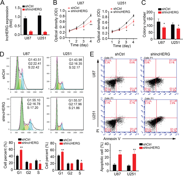 Figure 2: LncHERG promotes cell proliferation and inhibits cell apoptosis. (A) LncHERG was knocked down by transfection with specific shRNA. The mRNA levels were analyzed by qPCR in lncHERG-depleted cells. (B) MTT assays were conducted with shCtrl or shlncHERG U87 and U251 cells. LncHERG knockdown remarkably inhibited cell proliferation. (C) LncHERG knockdown impaired the abilities of colony formation of U87 and U251 cells. (D) less LncHERG-silenced cells entered into S phase. (E) LncHERG depletion dramatically increased the cell apoptosis in U87 and U251 cells. All data are representative of three independent experiments and expressed as mean ± SD. *p<0.05 and **p<0.01.