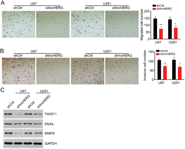Figure 3: LncHERG enhances cell migration and invasion. (A) LncHERG knockdown seriously inhibited cell migration. (B) LncHERG silence impaired the ability of cell invasion. (C) The expression levels of tumor metastasis-related proteins were measured by WB. LncHERG depletion remarkably inhibited cell metastasis in U87 and U251 cells. All data are representative of three independent experiments and expressed as mean ± SD. *p<0.05 and **p<0.01.