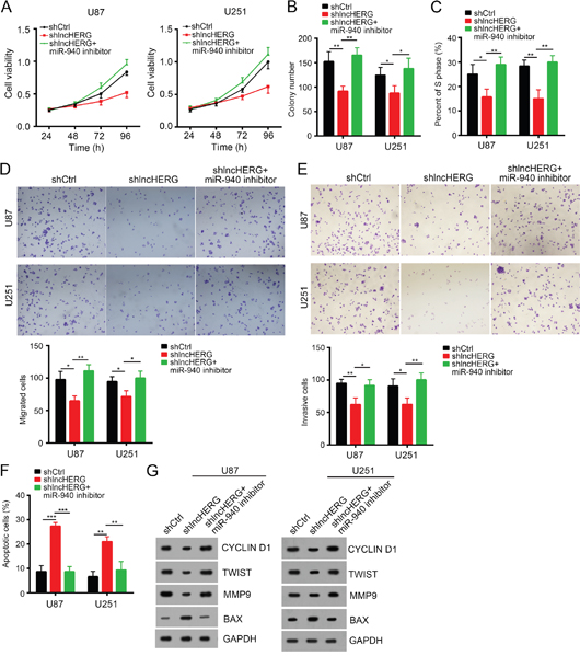 Figure 6: LncHERG promoted cell proliferation, migration and invasion by sponging miR-940 in glioblastoma. (A) lncHERG knockdown inhibited cell proliferation while overexpression of miR-940 mimic in the meantime reversed this trend as shown by MTT assays. (B) lncHERG knockdown inhibited colony formation while overexpression of miR-940 mimic in the meantime promoted colony formation in U87 and U251 cells. (C) lncHERG silence inhibited cell entry into S phase while transfection with miR-940 mimic in the meantime promoted cell division. (D) and (E) lncHERG depletion remarkably inhibited cell migration and invasion while overexpressing miR-940 in the meantime promoted cell migration and invasion. (F) lncHERG knockdown promoted cell apoptosis while miR-940 overexpression in the meantime inhibited cell apoptosis. (G) lncHERG knockdown inhibited cell proliferation, migration and invasion while overexpressing miR-940 in the meantime reversed it in U87 and U251 cells. The protein levels of CYCLIN D1, TWIST, MMP9 and BAX were checked by Western blot. All data are representative of three independent experiments and expressed as mean ± SD. *p<0.05, **p<0.01 and ***p<0.001.