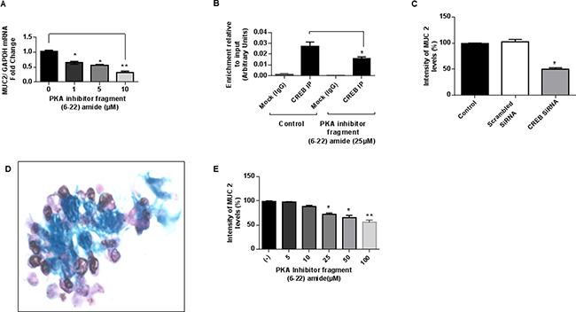 Figure 2: PKA/CREB signaling drives MUC2 production in vitro. (A) PKA inhibitor (fragment 6–22 amide) reduced MUC2 mRNA expression in a dose-dependent manner in LS174T cells at 24 hours; commercially available primers and probe specific for MUC2 and GAPDH cDNA were used for real-time PCR assay; relative amounts of MUC2 mRNA were determined after normalization of mucin transcripts to that of GAPDH. (B) PKA inhibitor decreased CREB-transcription factor binding to the MUC2 promoter at 6 hours as shown by ChIP assay; chromatin solutions were immunoprecipitated (IP) using 4 μg of anti-CREB antibody; for a negative control (mock) rabbit IgG was used. (C) MUC2 protein expression was inhibited following exposure of LS174T cells to CREB siRNA (10 mM) compared to scrambled siRNA at 72 h as shown by flow cytometry assay; fixed and permeabilized cells were stained with the MUC2-FITC antibody; intracellular immunostaining was analyzed using Accuri C6 Flow Cytometer. (D) Alcian blue staining of in vitro colonoid cultures of mucinous appendix cancer grown in matrigel demonstrating abundant extracellular mucin (blue stain). (E) PKA inhibitor (fragment 6–22 amide) reduced MUC2 protein expression as shown by flow cytometry assay in colonoid cultures of mucinous appendix cancer at 24 hours. Error bars represent standard error of the mean (SEM) from triplicate experiments. Asterisk represents a statistically significant difference compared with the control group (*p < 0.05; **p < 0.01). (PCR: polymerase chain reaction; siRNA: small interfering RNA; ChIP: chromatin immunoprecipitation).