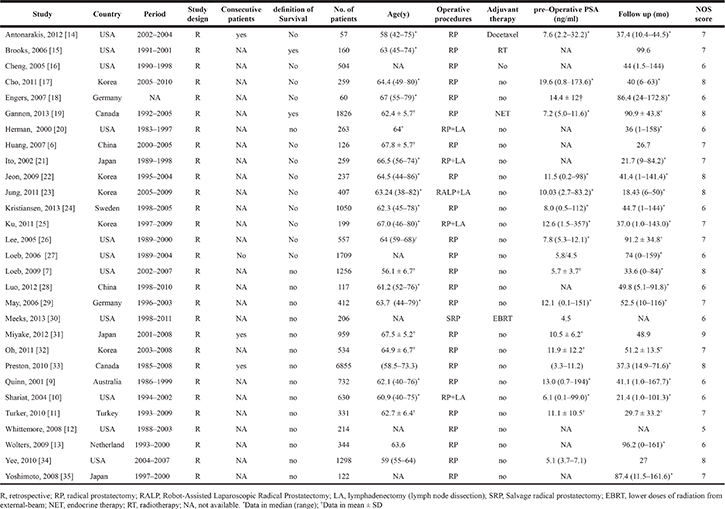 For each of eligible study, information was extracted and cross-checked by two independent investigators: (1) baseline characteristics: information of first author, year of publication, study design type, study location, period of recruitment, survival definition, sample size, age, operative procedures, adjuvant therapies, pre-operative PSA level, duration of follow-up; (2) survival analysis: end-point, patient numbers and percentage of specific pathological traits, hazard ratios (HR) combined with 95% confidence intervals (CI) and P value of univariate and multivariate analysis, primary endpoint and co-factors of Cox’s proportional hazards regression models.