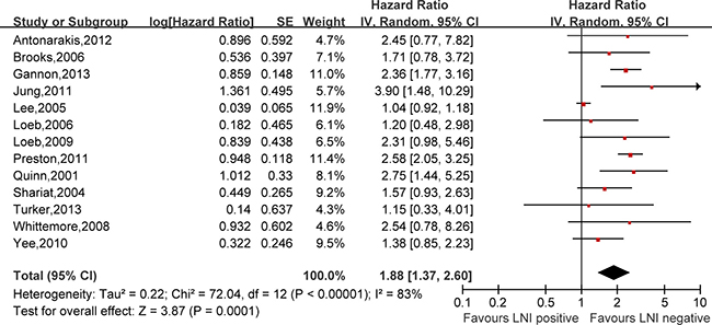 Hazard ratios (HRs) and 95% confidence intervals (CIs) respectively of univariate and multivariate Cox proportional hazard regression models of 29 literatures were listed in Supplementary Table 1. Meanwhile, the pooled HRs and 95% CIs for each clinicopathological feature are listed in Table 2. Our pooled results showed that all the six predictors were statistically significant for BCFS, the total analyses results were as follows: SVI (pooled HR:1.97 (1.79–2.18), p < 0.00001, Figure 2), PSM (pooled HR:1.79 (1.56–2.06), p < 0.00001, Figure 3), ECE (pooled HR: 2.03 (1.65–2.50), p < 0.0001, Figure 4), LVI (pooled HR:1.85 (1.54–2.22), p < 0.00001, Figure 5), LNI (pooled HR: 1.88, (1.37–2.60), p = 0.0001, Figure 6), PNI (pooled HR:1.59 (1.33–1.91), p < 0.00001, Figure 7).